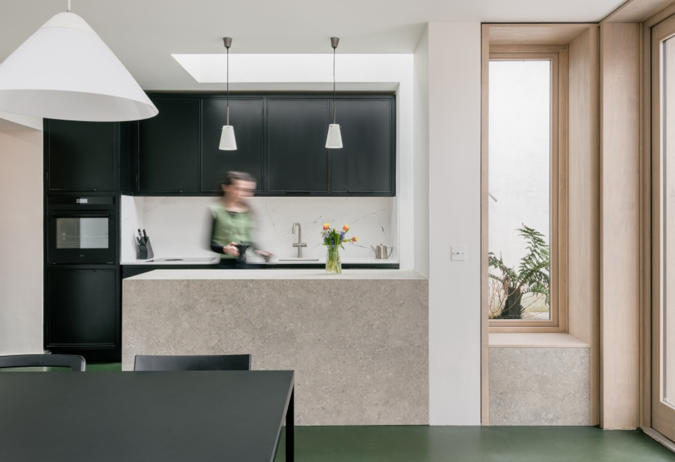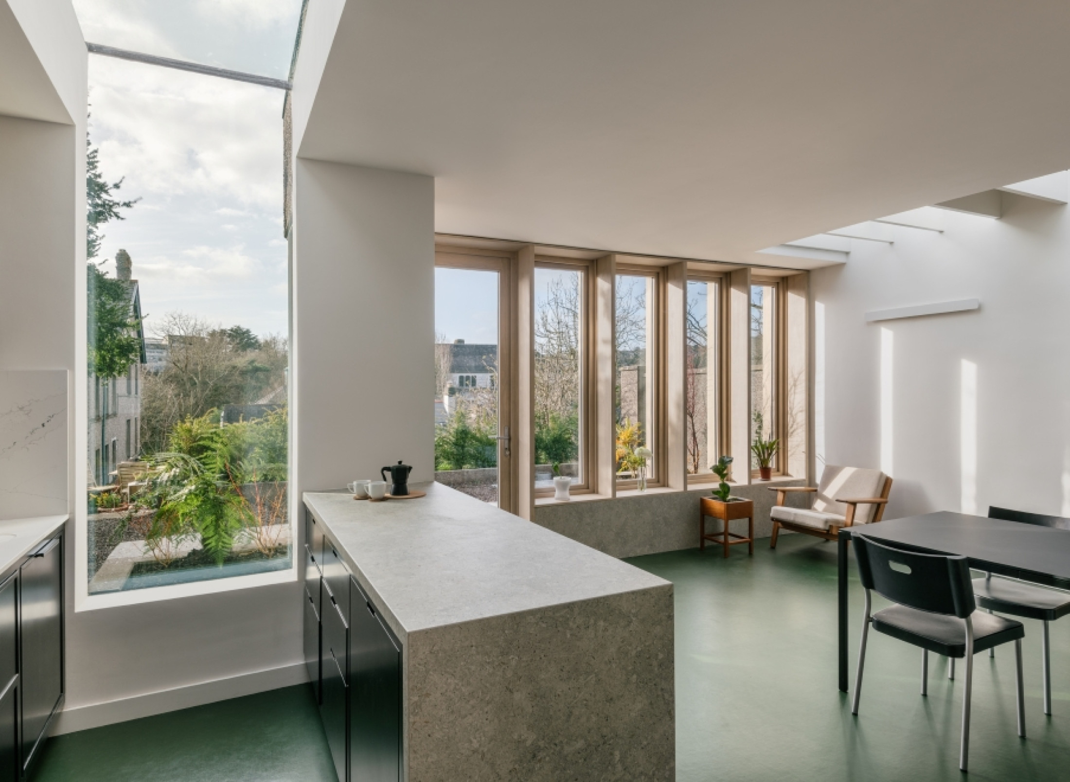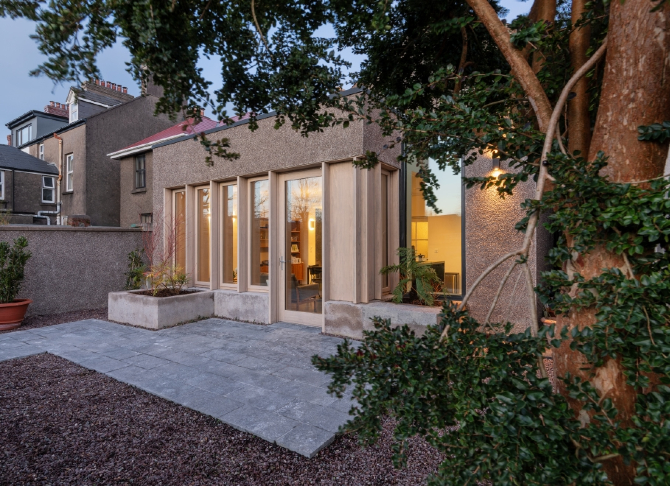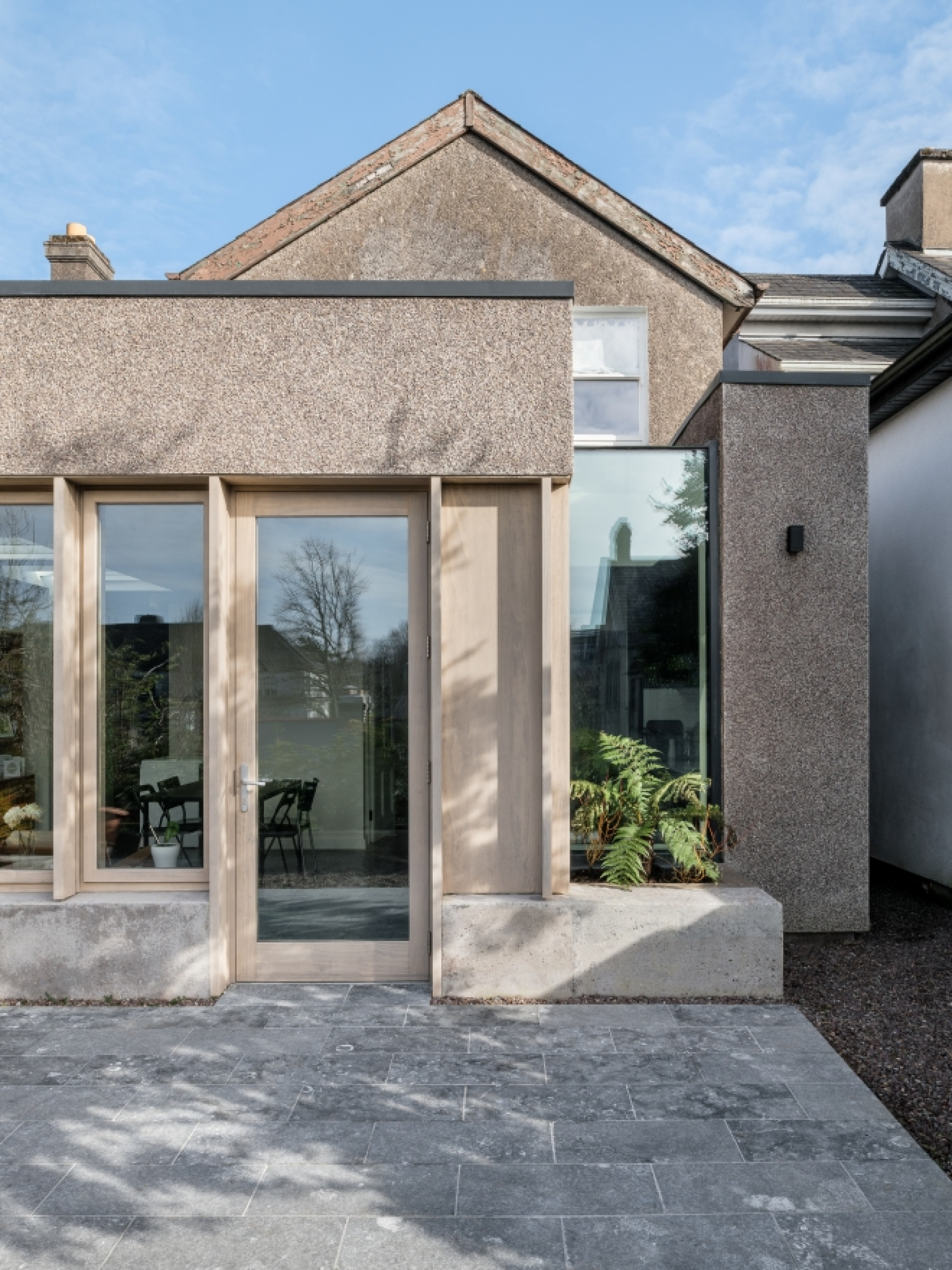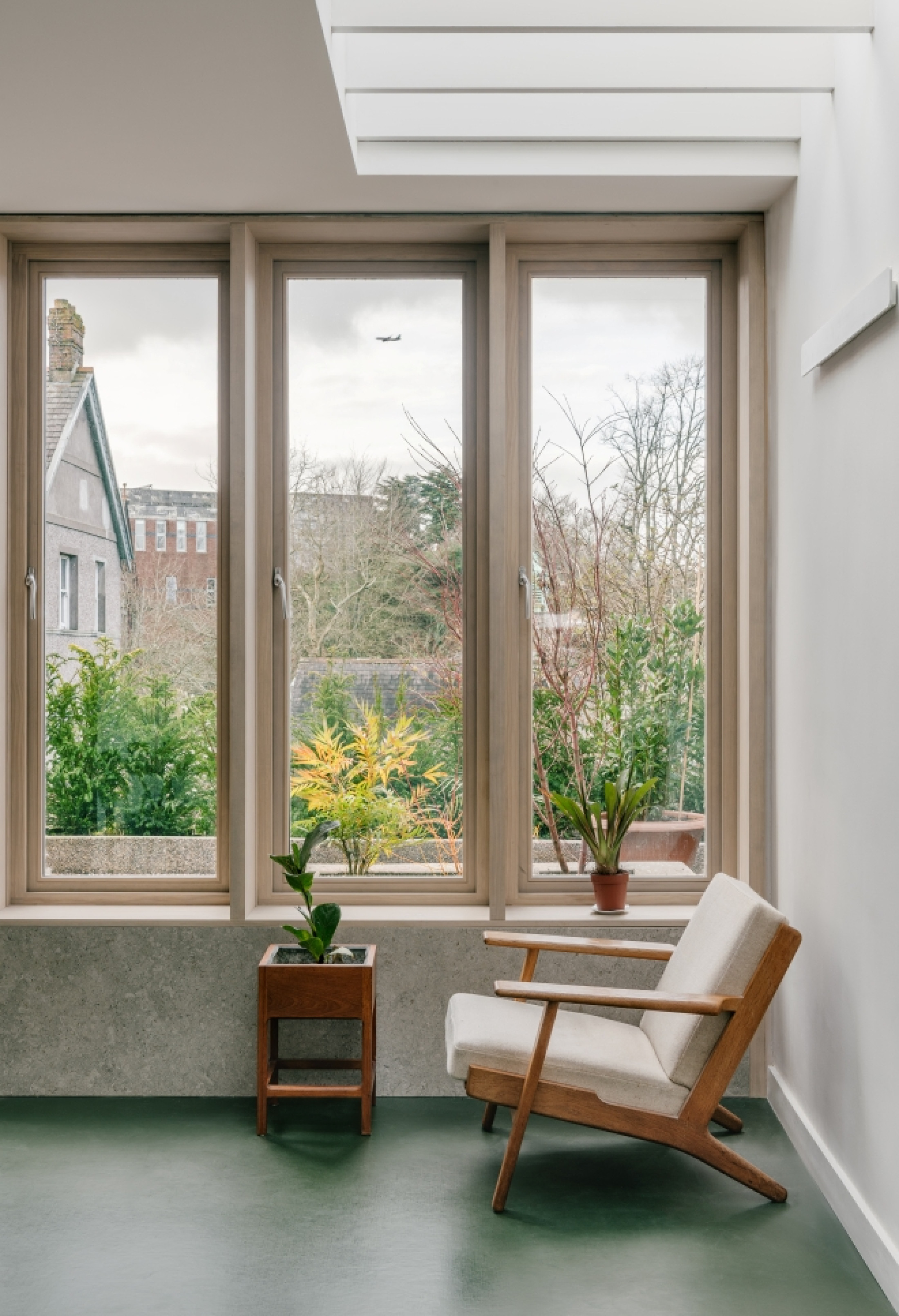 A new extension to a traditional townhouse set in an historic part of Cork City adjacent to University College Cork. The design proposes to reconnect the living spaces with the rear garden and draw in light from a series of roof lights. A deep recessed bay window made from Accoya wood sitting on a polished concrete plinth gives framed views to the garden while also providing shade.